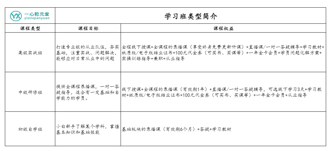 一心乾元堂易学风水学习班开设陪跑班、普惠班、研修班、弟子班多种类型满足不同易友学员的需求。