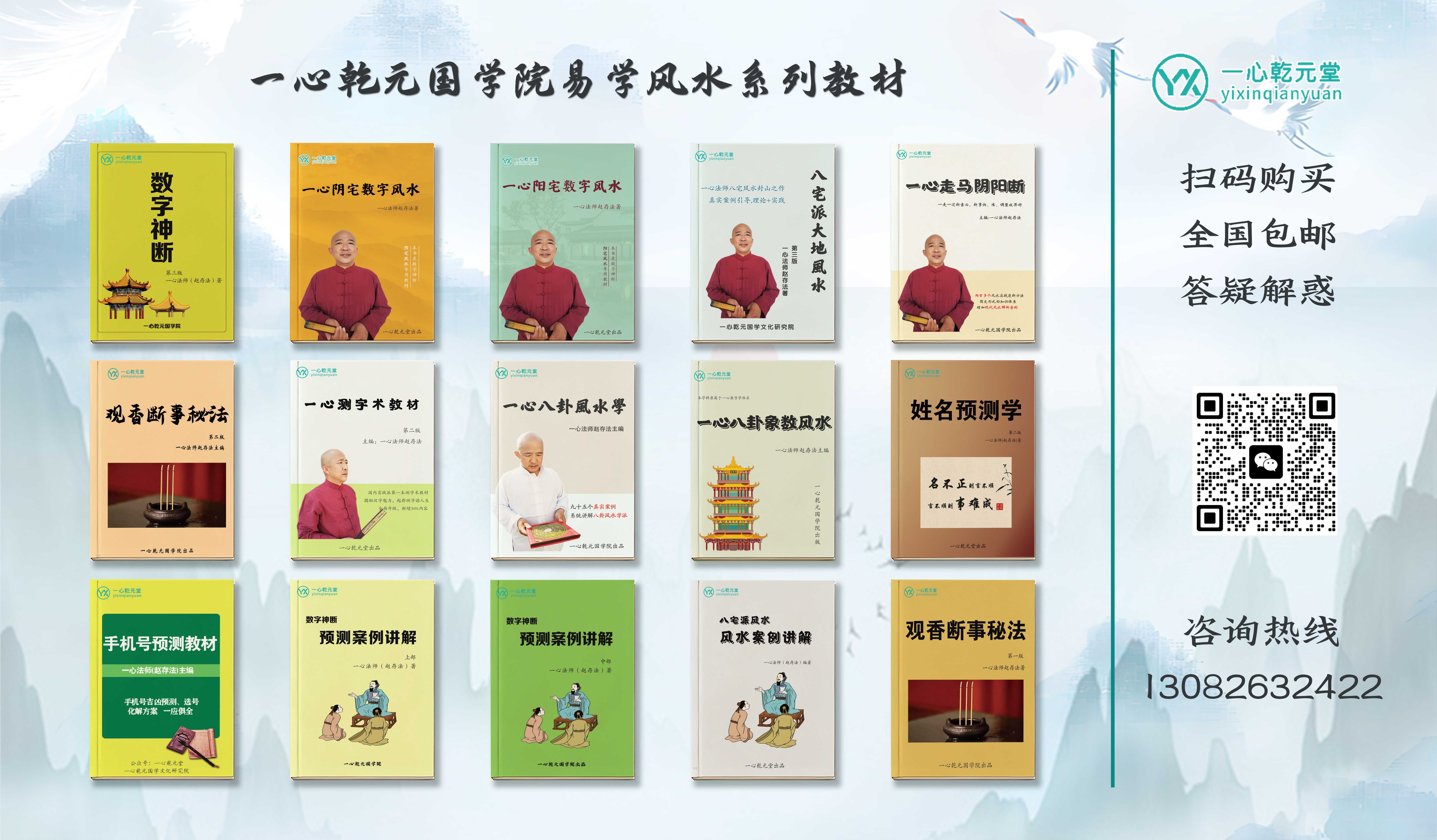 一心乾元国学院一直致力于国学文化的标准化,现代化,实战化,努力以最通俗的方式将国学智慧传递给人们,近年来,在一心法师的组织下,我们组织编写了《一心数字神断》,《观香断事秘法姓》《阳宅风水风水神断》《八宅派大地风水》《八卦风水学》、《走马阴阳断》、《测字术》、《八宅风水案例》等一系列通俗易懂的易学风水书籍,成为广大易学爱好者,机构的学习首选。